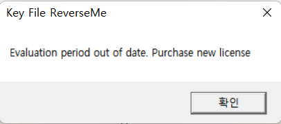 ReverseMe 파일을 실행해보면 평가 기간이 만료되었으니 새 라이센스 구입하라는 메세지 박스가 뜬다.
