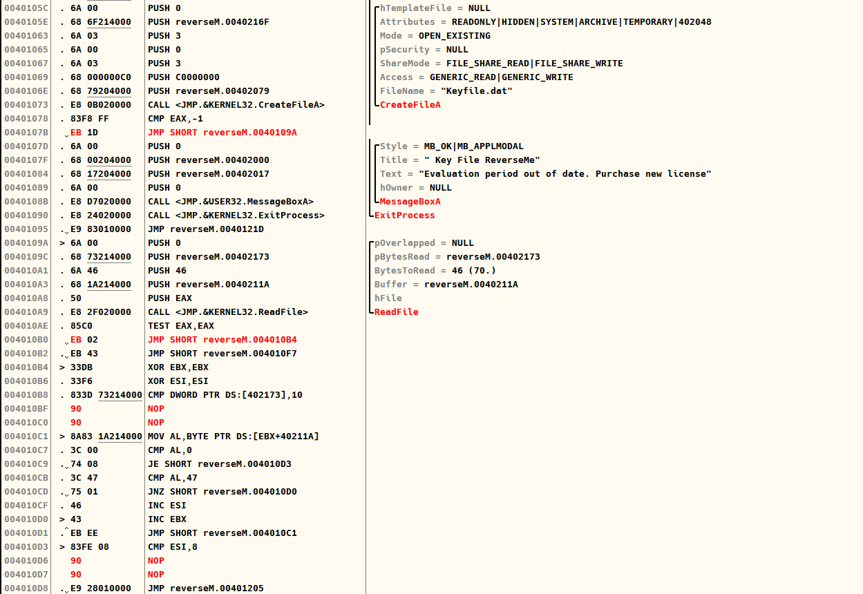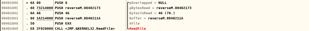 그 다음 ReadFile의 결과를 검사하는데 eax가 0일 경우, 즉 실패했을 때 4010F7로 이동한다.
