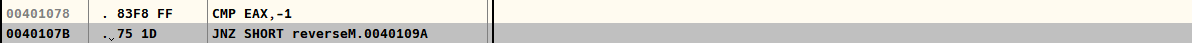 그 다음 실행결과를 -1(실패했을때)과 비교해서 다를 경우, 즉 성공했을 때 40109A 주소로 점프하고 실패했을 때 메세지 박스 호출 부분으로 점프한다.