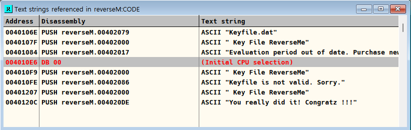 OllyDbg에서 우클릭후 Search for > all referenced text strings를 클릭하면 문자열들을 볼 수 있다.
